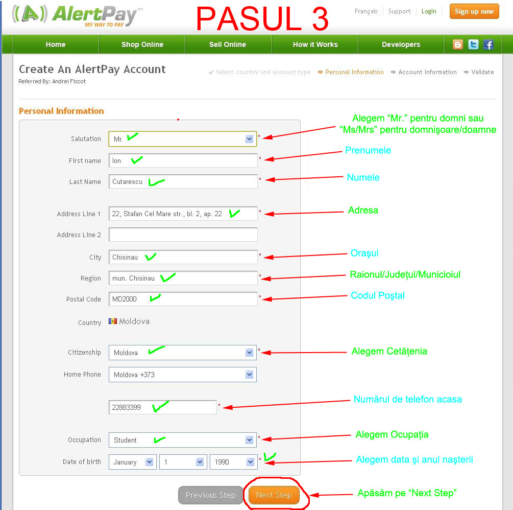 PASUL 3: Completăm prima parte a formei de înregistrare şi apăsăm pe "Next Step"