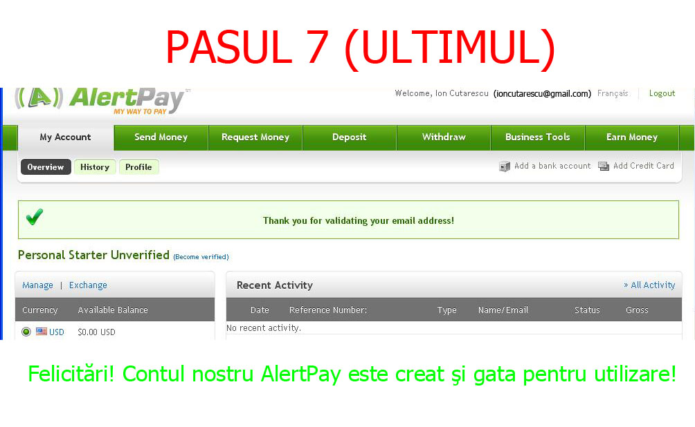 înseamnă că adresa de email a fost validată, iar contul nostru AlertPay a