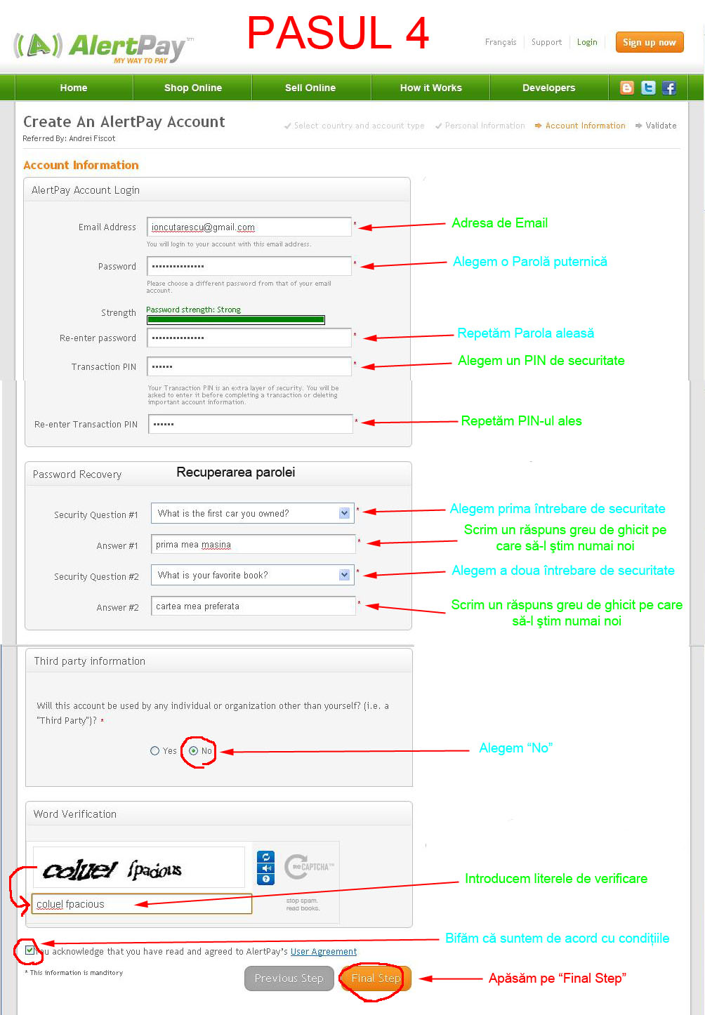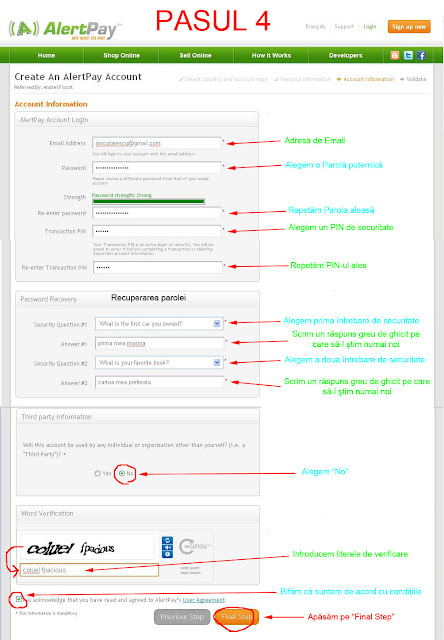 PASUL 4: Completăm a doua parte a formei de înregistrare şi apăsăm pe "Final Step"